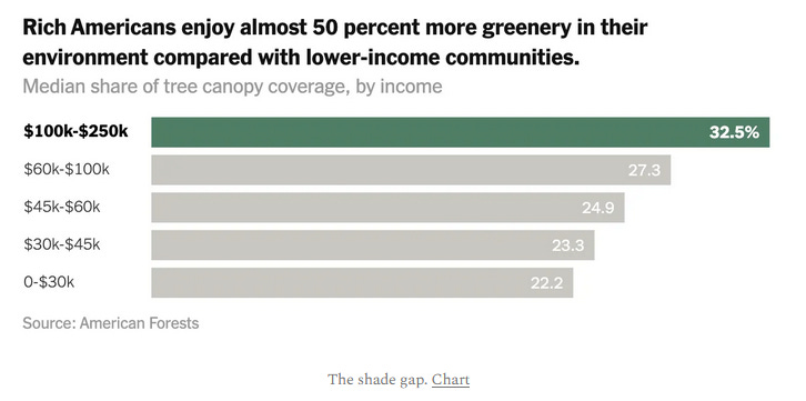 Article: Jeremy Ney and Michael Tiede talk about ‘tree inequality’ in the US. From their article, the chart below shows how greenery differs between neighborhoods of different incomes. This also translates into higher ambient street temperatures for neighborhoods with fewer trees.