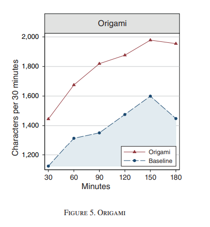 As the chart above shows, the rate of character entry was higher throughout the duration of the work session (the blue line is the baseline with no bonus). So how can we explain all these findings?