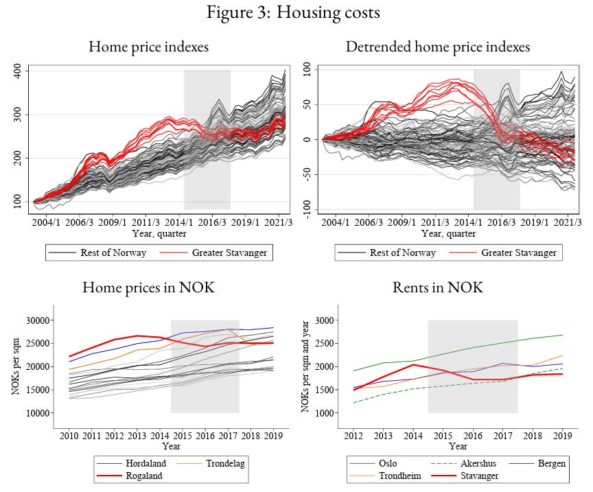 Both home prices and rents in the Stavanger area (Rogaland) dropped during the oil shock, while the rest of Norway had an increase in rents and prices. Home prices and rents in Stavanger fell by around 30% compared to other areas.
