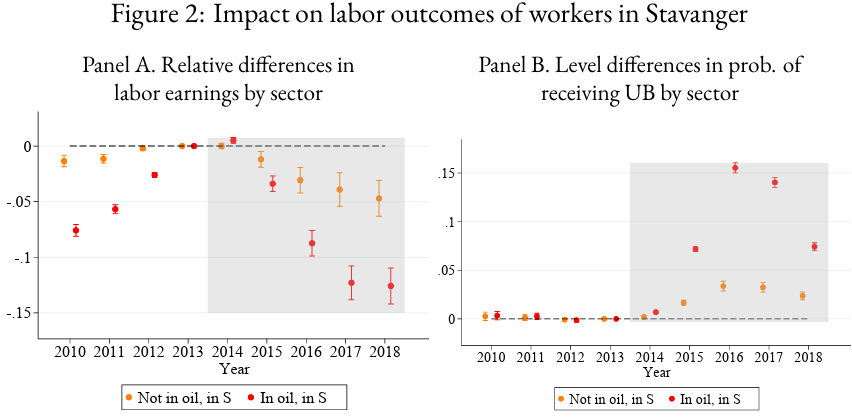 In Panel A of the figure above, we see how the earnings of workers in Stavanger changed relative to those in other areas of Norway. The baseline year is 2013 (both the orange dots and red dots are on zero). A dot below (above) the zero line tells us that in that year, the relative income between Stavanger workers and other Norwegian workers was lower (higher) than in 2013. Thus, prior to the oil shock, Stavanger workers saw relatively faster income growth than the rest of Norway. After 2014, relative incomes fell significantly, with oil workers (red) seeing much larger declines.