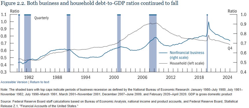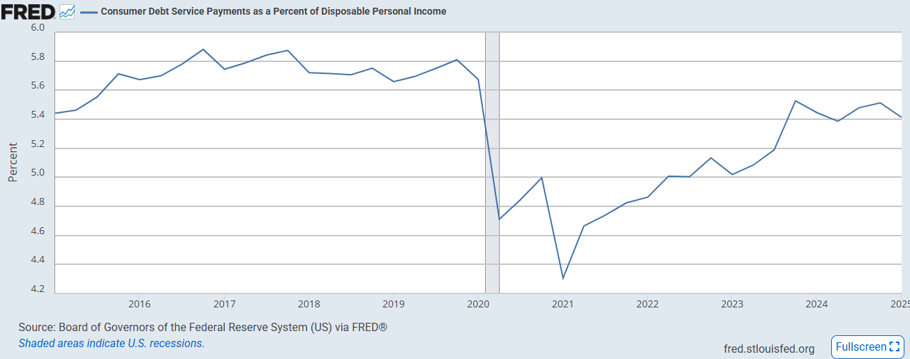 Again, the US consumer appears to be doing better than pre-pandemic. (Note, the lower levels of debt service payments to disposable income observed during the pandemic period between 2020-2023 was driven by elevated disposable income due to significant increases in government transfers.)