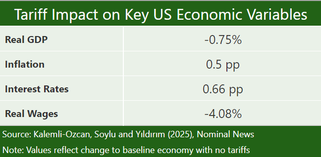 The above table shows that tariffs were estimated to lower real GDP by around 0.75% in the period after tariff enactment. Interestingly, this means that absent tariffs, real GDP growth in 2025 would have been around 3.3% (after adjusting for the government shutdown and adding the impact from the table), which would be a bit higher than 2024 real GDP growth.