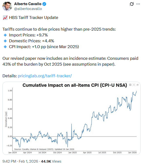 Since March 2025, Consumer Price Index (CPI) measured inflation (a slightly different inflation measure) would have been 1 percentage point lower had tariffs not been enacted.