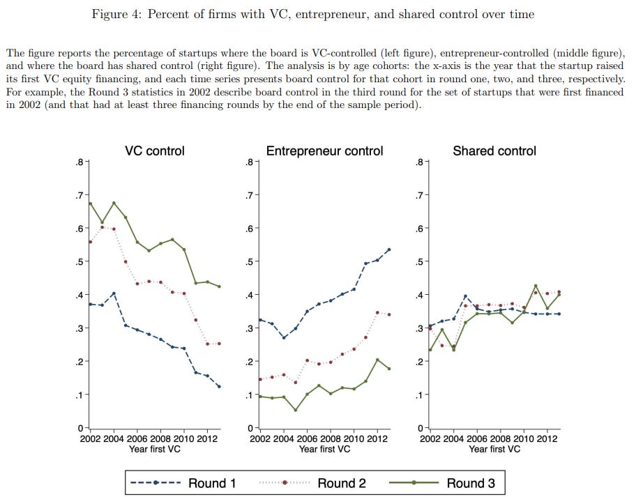 It’s worth noting that, historically, founders rarely had 50% control after the first round of funding, as can be seen in the middle chart.