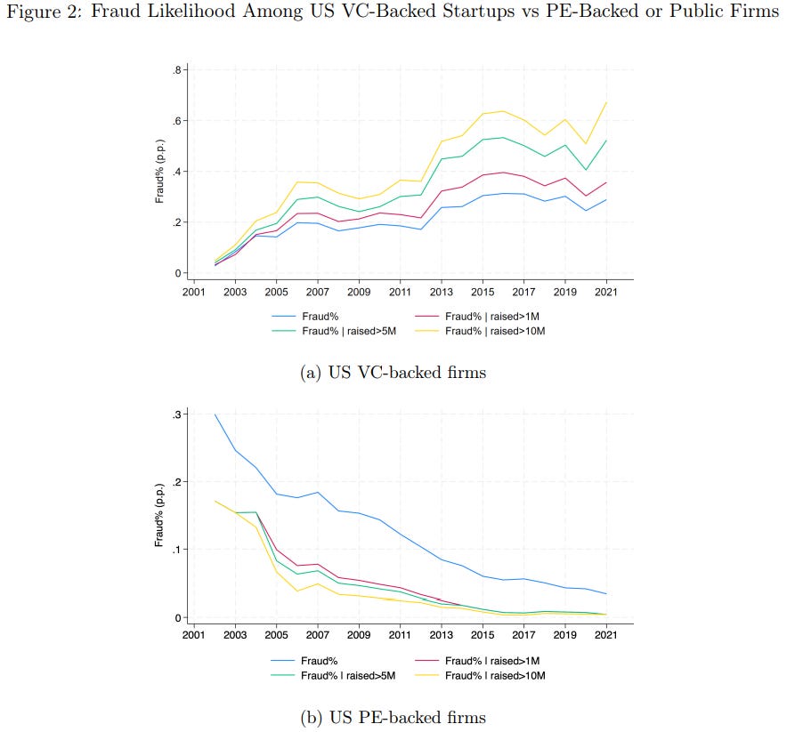 It is worth noting, that in other contexts, such as in the Private Equity-backed companies, DFHX found that fraud has not increased, and actually declined, clearly showing that oversight by investors, specifically in the VC space, is lacking: