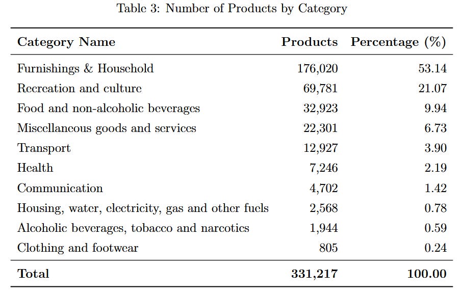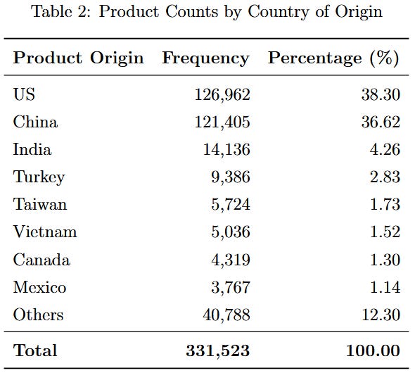 Next, CLV matched the products in their data set to the country of origin of the product. Of the 4 retailers, 2 retailers listed the country of origin of their product on their website. This allowed CLV to determine the country of origin for around 300,000 products. For the remaining 2 retailers, CLV relied on a generative AI prediction model that would search online to determine the country of origin of the product. CLV found that this procedure correctly predicted whether a good is “Domestic” or “Imported” 88% of the time, and can predict the specific country correctly 85% of the time. The prediction method was still only applied to 10% of the sample, resulting in a total of around 330,000 products for which both prices and the country of origin information are available.