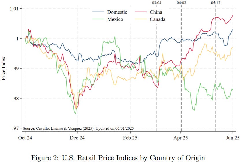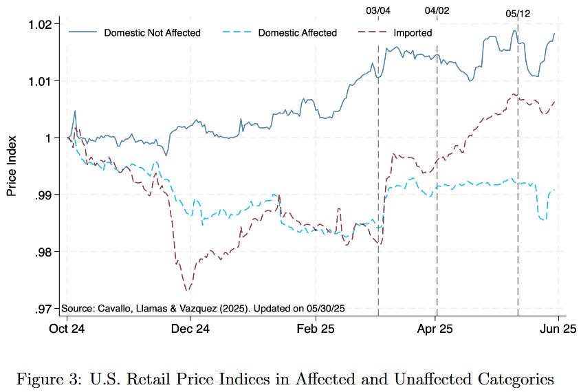 Cavallo, Llamas and Vazquez (2025) (“CLV”) looked at the impact of US tariffs directly on store retail prices. PriceStats, a private data firm, collects daily prices of goods by scraping online price information of large US retailers. CLV focused their analysis on 4 large US retailers and collected price data on specific products.